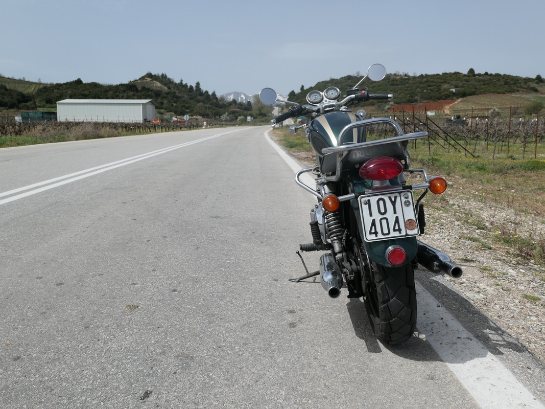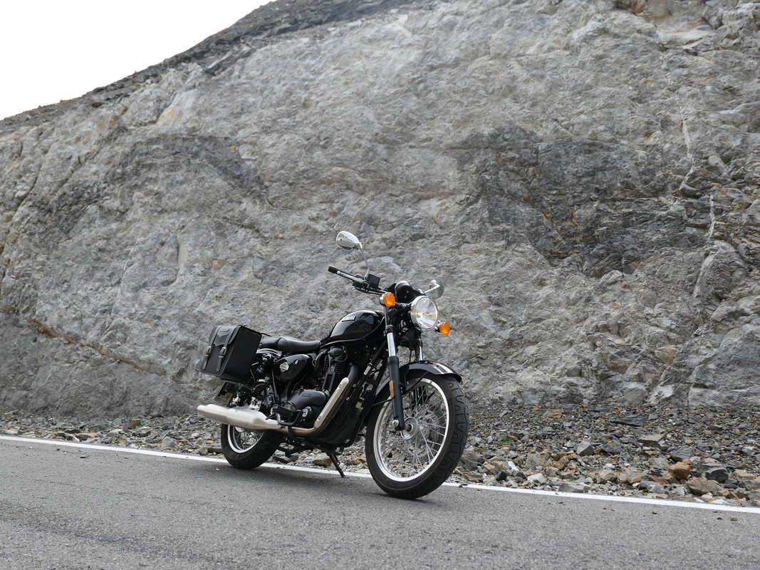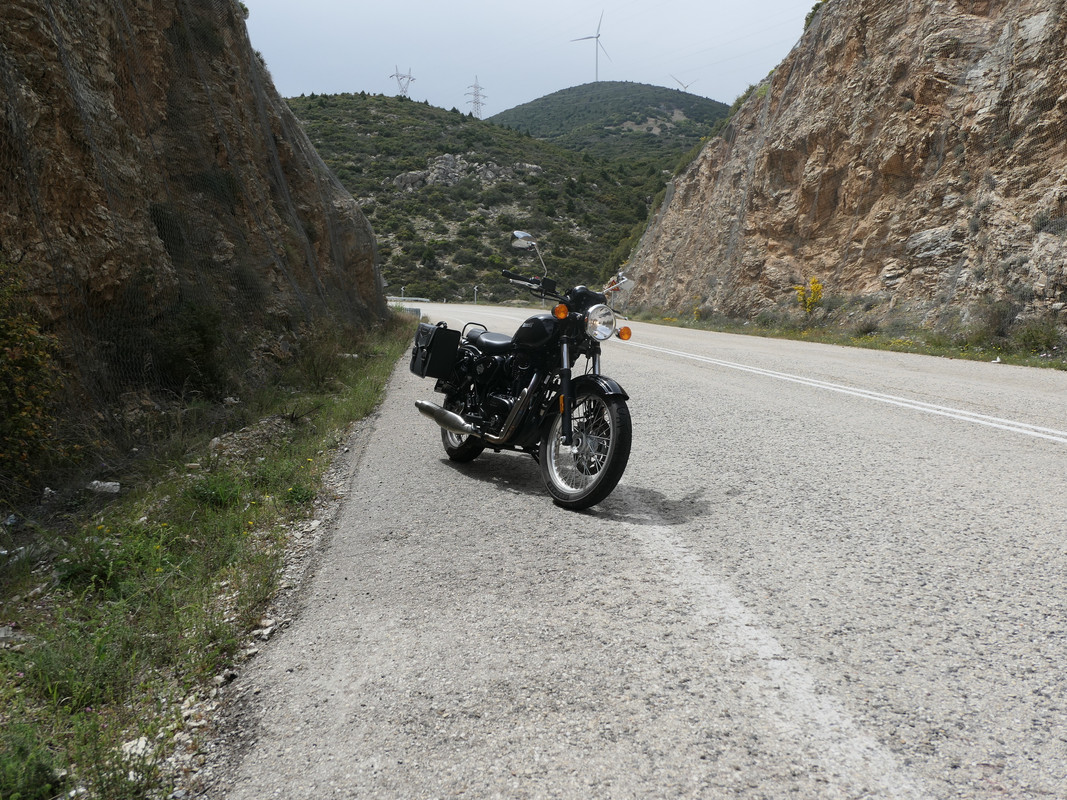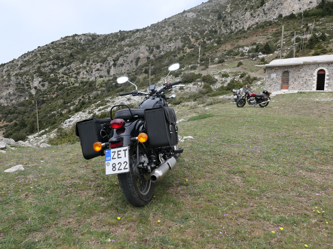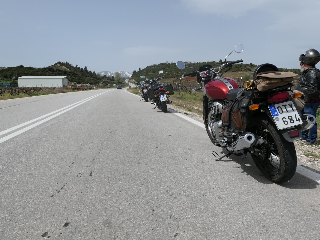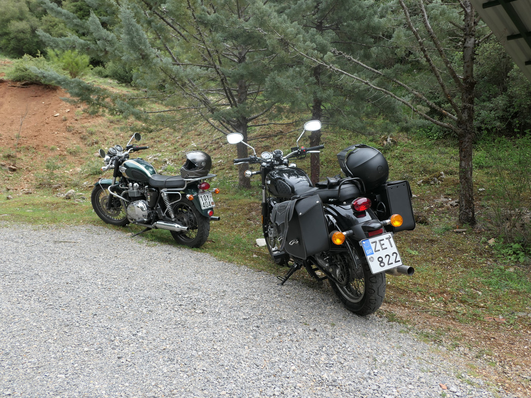 Σε αυτό το ταξίδι θα με συντρόφευαν ο Θανάσης με ένα Triumph Bonneville T100, o Βύρωνας με την Χριστίνα με ένα Royal Enfield Interceptor …