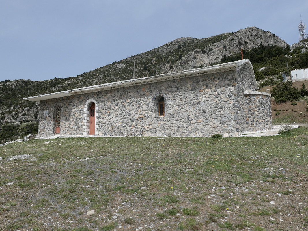 Στην κορυφή του περάσματος υπάρχει χωματόδρομος που οδηγεί στο εκκλησάκι του Προφήτη Ηλία