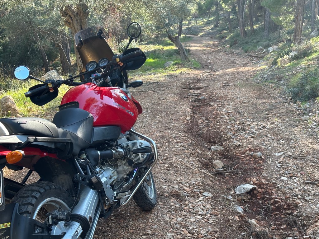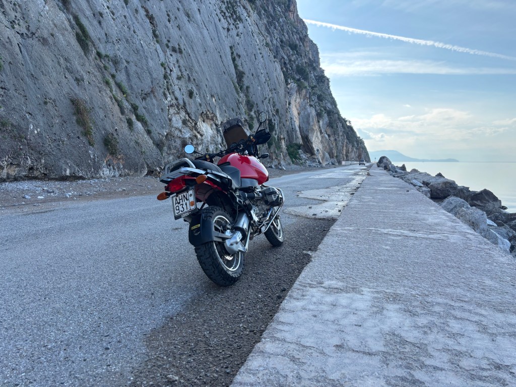 I thought the road would lead to a quiet beach—instead, it popped out onto the paved road to Porto Germeno. So I turned around and took the same dirt path back. Thanks to the short first gear and strong torque, climbing back up was a breeze, no clutch slipping needed.