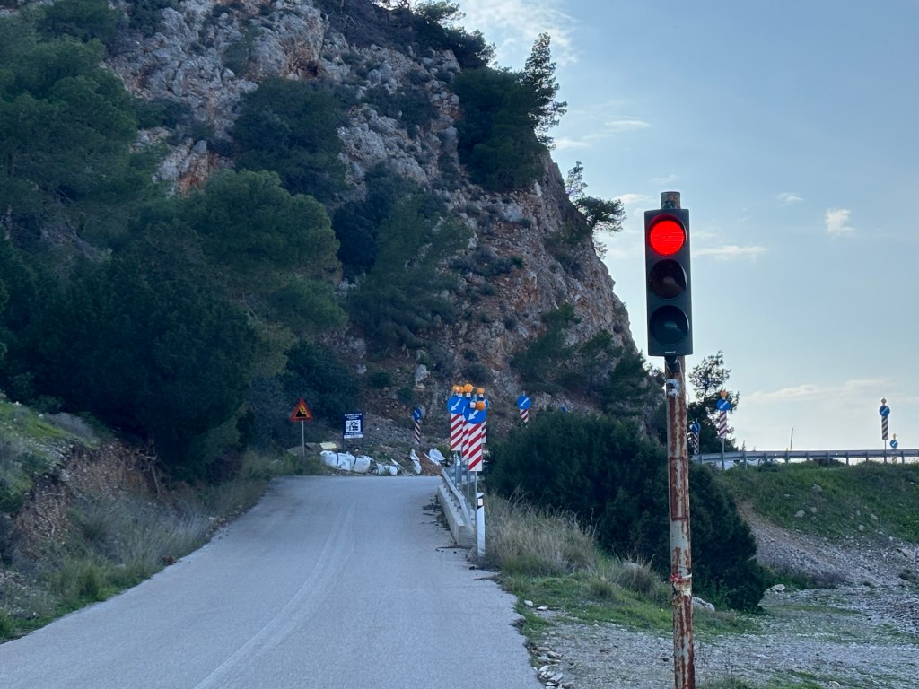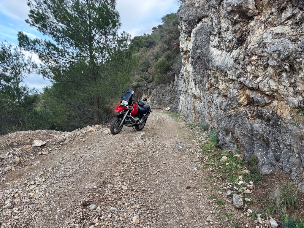 Second gear, and we climbed it like it was nothing. I’d planned to go up and come right back down, but the trail looked too interesting. A little further, then a little more, chasing the perfect photo spot… and eventually, we popped out onto the tarmac just before Perachora.
