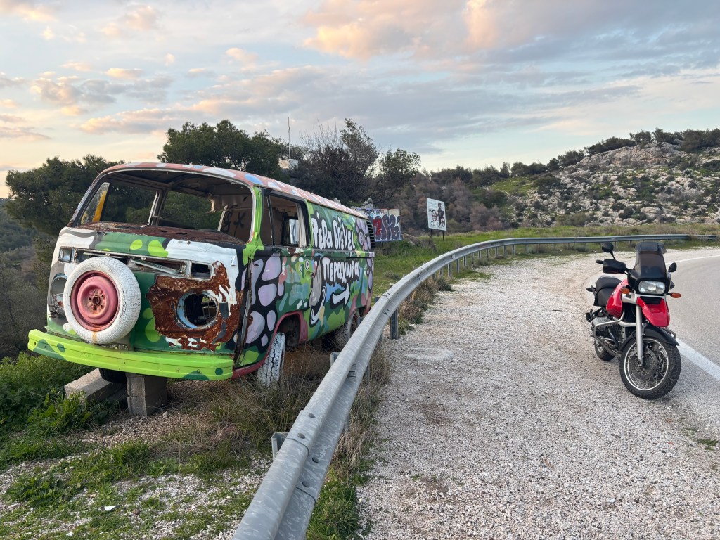 We chilled on Psatha beach for a breather, then continued toward Schinos through Alepochori. The road there is twisty with good asphalt, a great setup for Chunky to show her other side. She’s a joy in tight corners. She’s got the handling but no growl to stir your soul, another one of her weak points, maybe.
