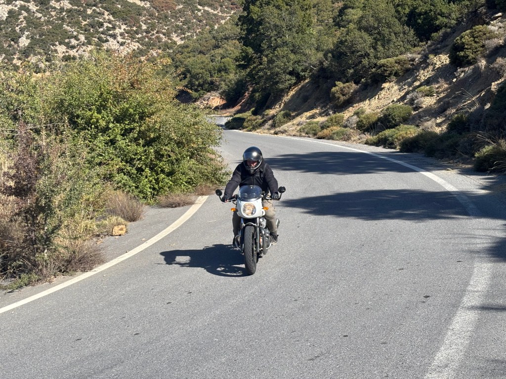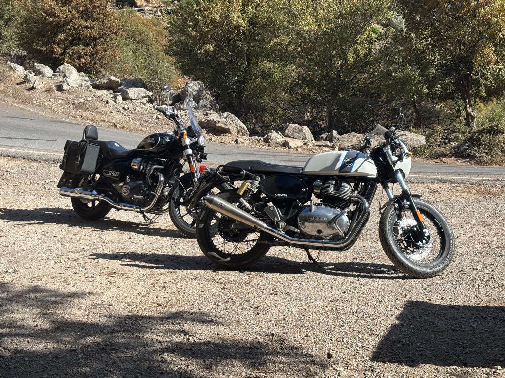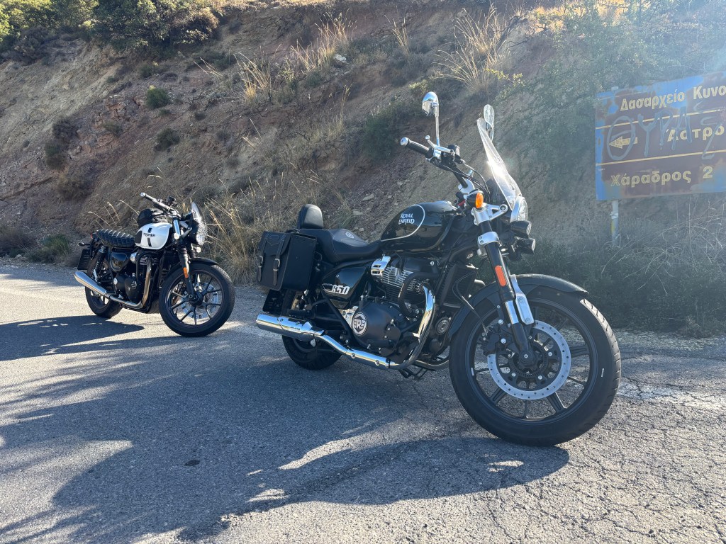 Στα ΣΕΑ, βρήκα τα παιδιά να πίνουν καφέ: ο Θανάσης με το Continental 650 και ο Θάνος με το Triumph Speed Twin. Πήρα και εγώ ένα καφεδάκι και πιάσαμε κουβέντα για το πλάνο. Το πρόγραμμα του Θανάση έμοιαζε φιλόδοξο, και εκεί πετάγεται ο Θάνος: